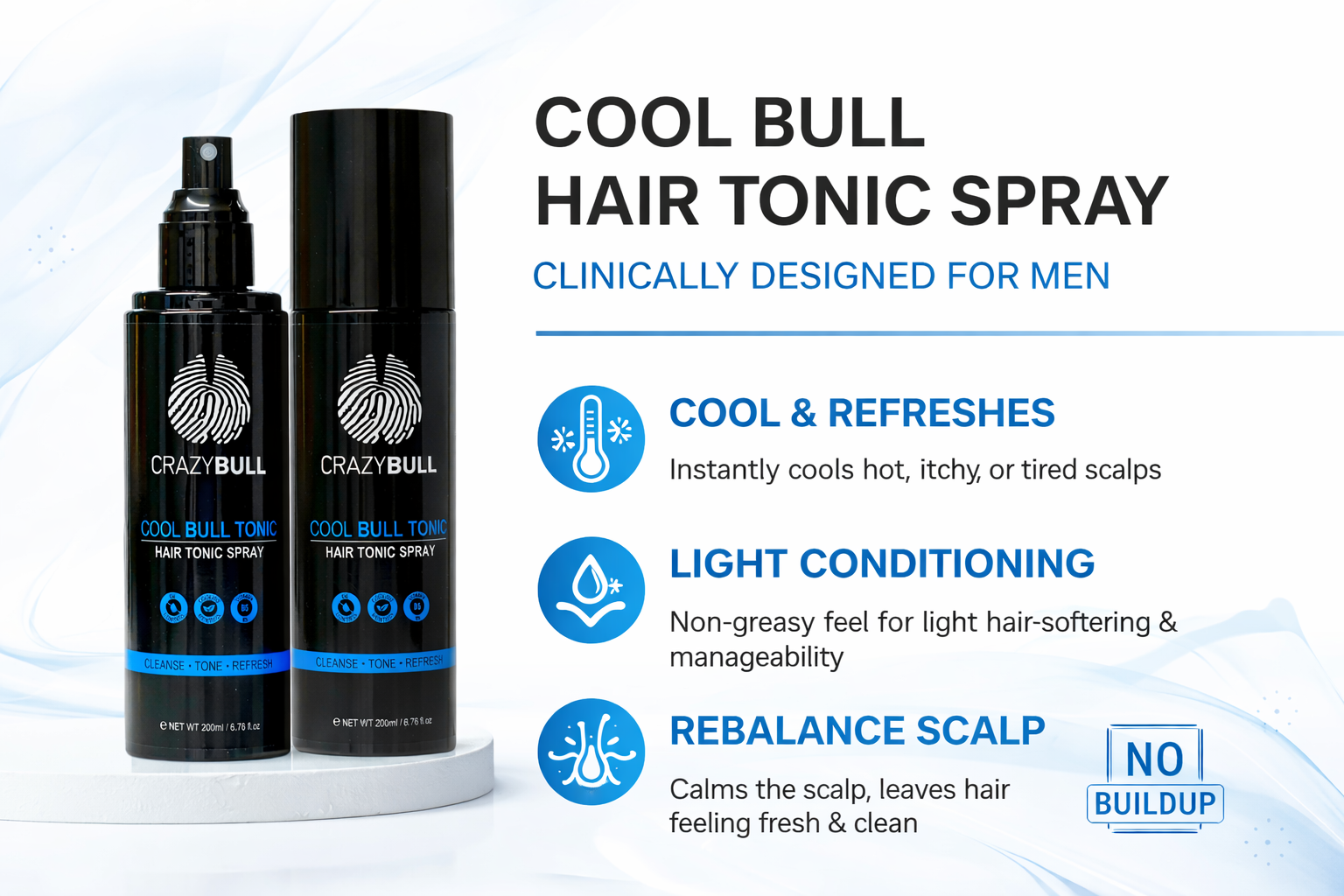 Some tonics can feel oily, heavy, or leave buildup. Cool Bull uses a water-lean, light conditioning system (like Cetrimonium Chloride + Panthenol) that refreshes and softens hair without weight or residue — so hair looks clean, not coated.
