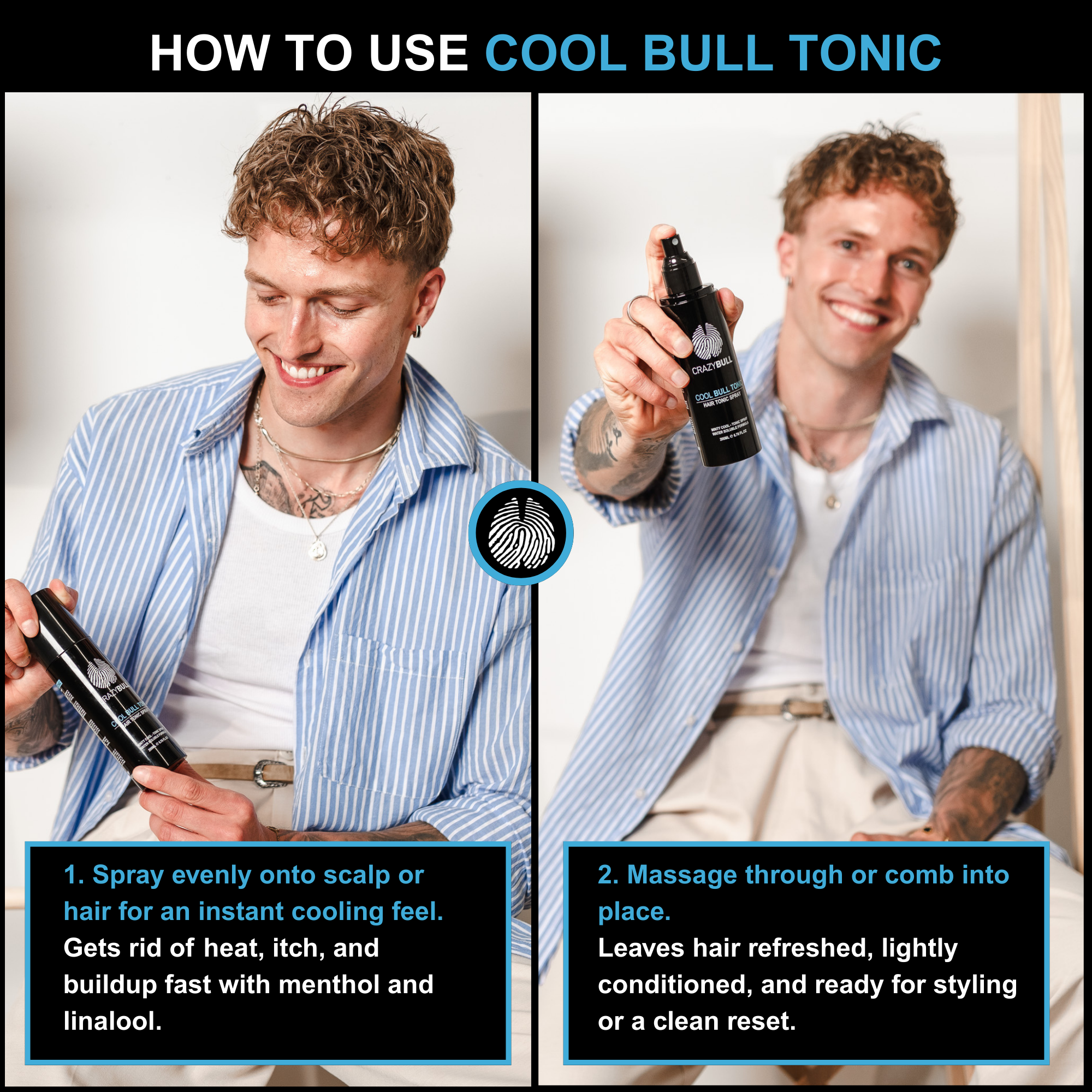 Cool Bull Tonic Spray - a refreshing hair tonic for hair that feels strong, clean, and energised. Perfect daily tonic for scalp health and post-cut freshness.