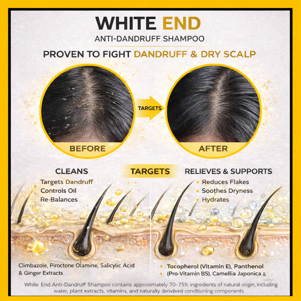 White End combines clinically recognised anti-dandruff actives with botanical extracts and conditioning ingredients. Many anti-dandruff shampoos focus only on flake removal and leave hair dry. White End targets dandruff at the source while helping maintain scalp comfort, hydration, and hair softness.