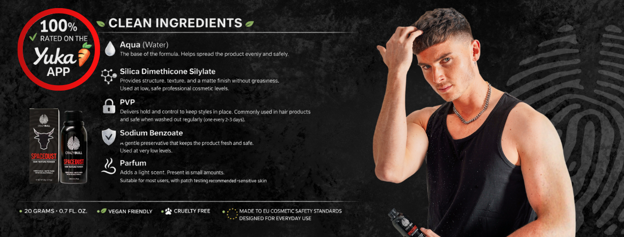 Space Dust is a lightweight styling powder made with cosmetic-grade ingredients designed to sit on the hair, not affect the hair follicle or scalp health. Ingredients such as natural silica mineral powder and water work by adding texture, conditioning, and hold to the surface of the hair shaft. They do not penetrate the scalp or interfere with hair growth.